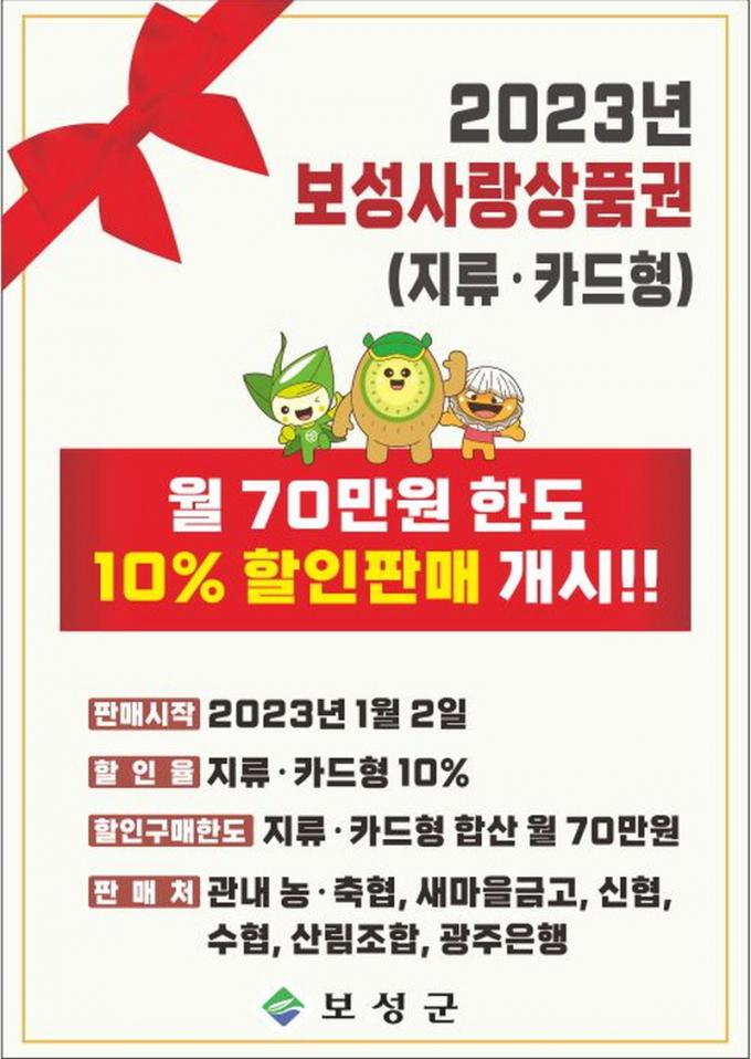 [µ¥Àϸ®Àü³² = ÃÖ¿µ¹Î ±âÀÚ] º¸¼º±ºÀÌ 2023³â¿¡µµ Áö¿ªÈÆóÀÎ º¸¼º»ç¶û»óǰ±Ç ÇÒÀÎÀ²À» 10%·Î À¯ÁöÇÑ´Ù. 2023³âºÎÅÍ´Â ¿ù 70¸¸ ¿ø Çѵµ ³»¿¡¼ ±¸¸Å°¡ °¡´ÉÇϸç, ±¸¸Å ½ÃÀÛÀÏÀº ¿À´Â 1¿ù 2ÀϺÎÅÍ´Ù. ƯÈ÷, ±¹ºñ º¸Á¶±Ý Áö¿øÀÌ ºÒÈ®½ÇÇÑ »óȲ¿¡¼µµ 2023³â º¸¼º»ç¶û»óǰ±Ç ÇÒÀÎ ÆÇ¸Å¸¦ Áö¼ÓÇϱâ À§ÇØ º¸¼º±ºÀº ÀÚü ¿¹»ê 29¾ï ¿øÀ» Æí¼ºÇß´Ù.