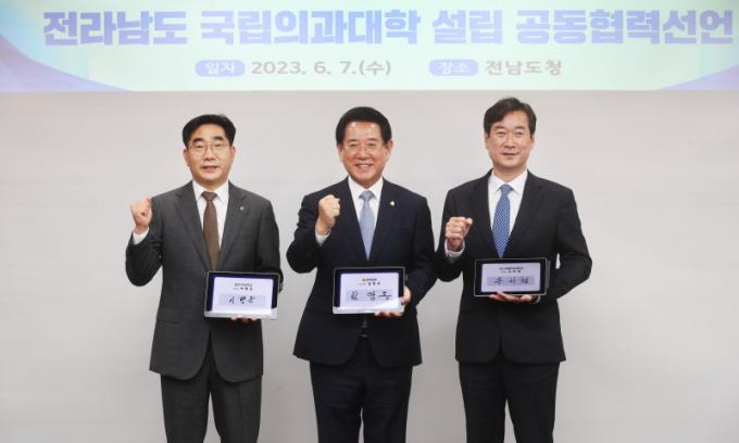 ±è¿µ·Ï Àü¶ó³²µµÁö»ç¿Í ¼ÛÇÏö ¸ñÆ÷´ë ÃÑÀå, À̺´¿î ¼øÃµ´ë ÃÑÀåÀÌ 7ÀÏ ¿ÀÀü µµÃ» Á¢°ß½Ç¿¡¼ Àü¶ó³²µµ ±¹¸³Àǰú´ëÇÐ ¼³¸³À» À§ÇÑ °øµ¿Çù·Â¼±¾ð¹®À» ¹ßÇ¥Çϰí ÀÖ´Ù. (¿ÞÂʺÎÅÍ) À̺´¿î ÃÑÀå, ±è¿µ·Ï Áö»ç, ¼ÛÇÏö ÃÑÀå.