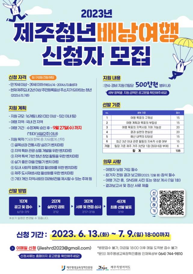 ¡®2023³â Á¦ÁÖû³â¹è³¶¿©Ç࡯Àº Äڷγª19·Î ÀÎÇØ ÁߴܵǾú´Ù°¡ 4³â ¸¸¿¡ Àç°³µÇ¾úÀ¸¸ç, 3ÀÎ ÀÌ»ó 5ÀÎ À̳»·Î ±¸¼ºµÈ 16°³ ³»¿ÜÀÇ ÆÀÀ» ¼±¹ßÇÏ¿© ÇÑ ÆÀ´ç ÃÖ´ë 500¸¸ ¿øÀÇ ±¹³» ¿©Çà °æºñ¸¦ Áö¿øÇÒ ¿¹Á¤ÀÌ´Ù.